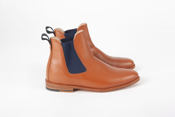 Das Foto zeigt das Handmacher Modell 96 in Kalbleder Cognac mit blauem Stoffeinsatz.