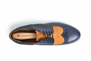 Das Foto zeigt das Handmacher Modell 14 in Kalbleder Blau (Lederart 1 + 3) mit Velourleder Cognac (Lederart 2).